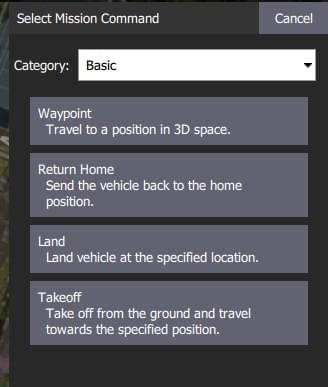 The list of available commands will depend on firmware and vehicle type. Examples may include: Waypoint, Start image capture, Jump to item (to repeat mission) and other commands.