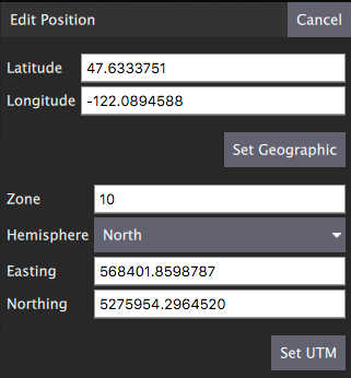The Edit Position Dialog allows you to specify a detailed position for an item in either Geographic or UTM coordinate systems. It is available from the Polygon Tools menu as well as the hamburger menu of any mission item which specifies a coordinate: