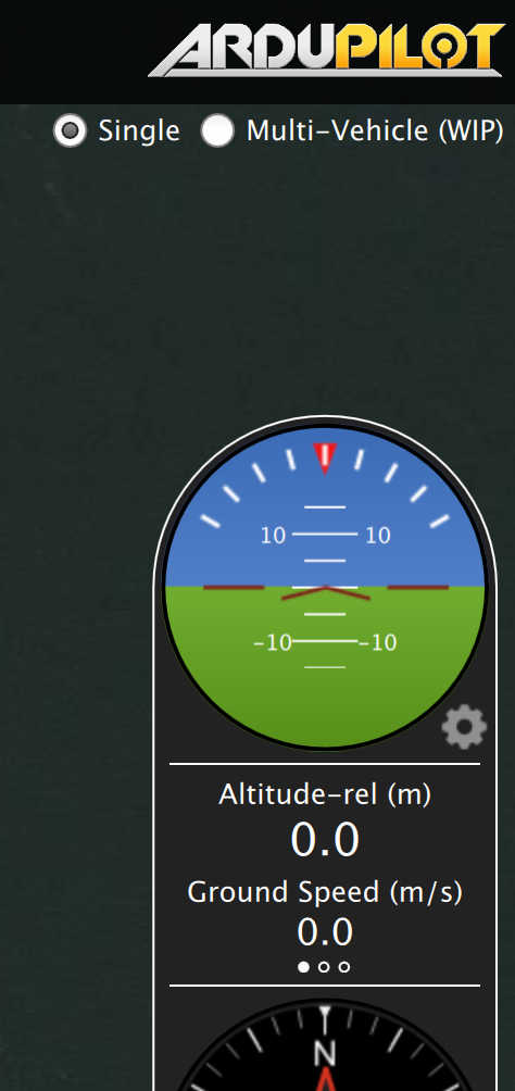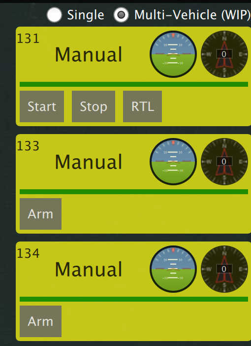 The example above shows three vehicles. The numbers are the vehicle id. In the large font is the current flight mode. You can click the flight mode name to change to a different flight mode. To the right are small version of the instruments for each vehicle. You can command the vehicle to do the following actions from the control panel:
