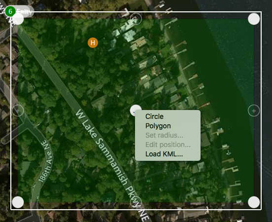 The fence which is currently selected by the "Edit" radio button will show the on screen editing controls such as the drag points for polygon editing.