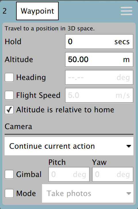 The camera section allows you to specify a camera action to take, control the gimbal and set your camera into photo or video mode.