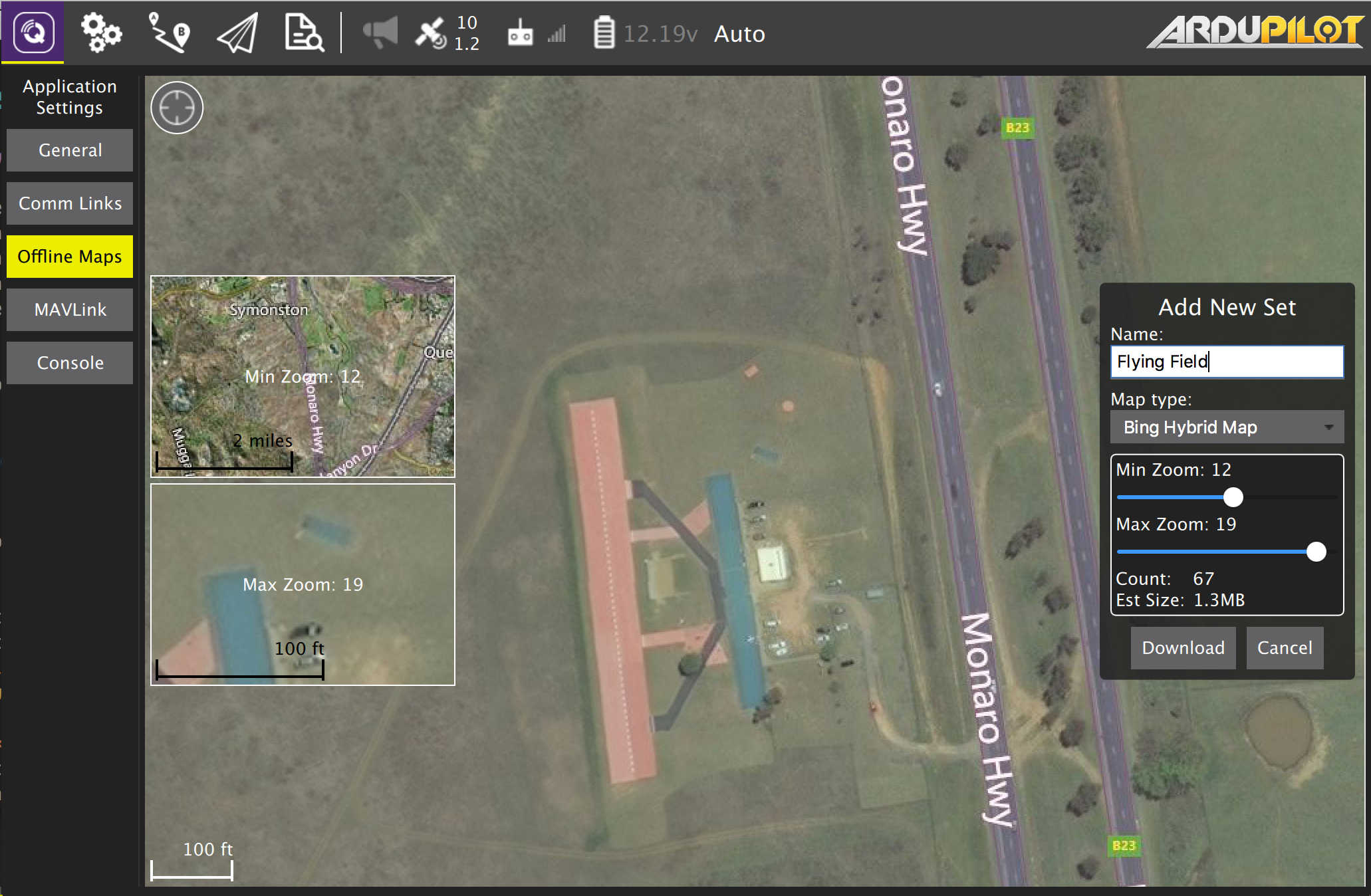 From here you can name your set as well as specify the zoom levels you want to cache. Move the map to the position you want to cache and then set the zoom levels and click Download to cache the tiles.